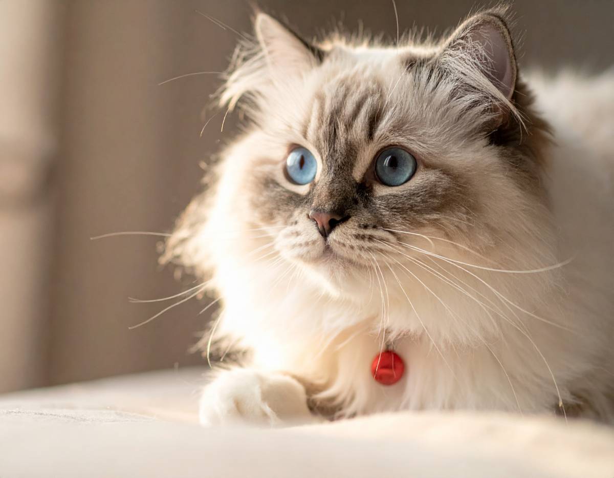 Le Birman est célèbre pour ses yeux bleus saphir intenses et ses quatre pattes "gantées" de blanc pur, qui contrastent avec son pelage mi-long aux points de couleur.